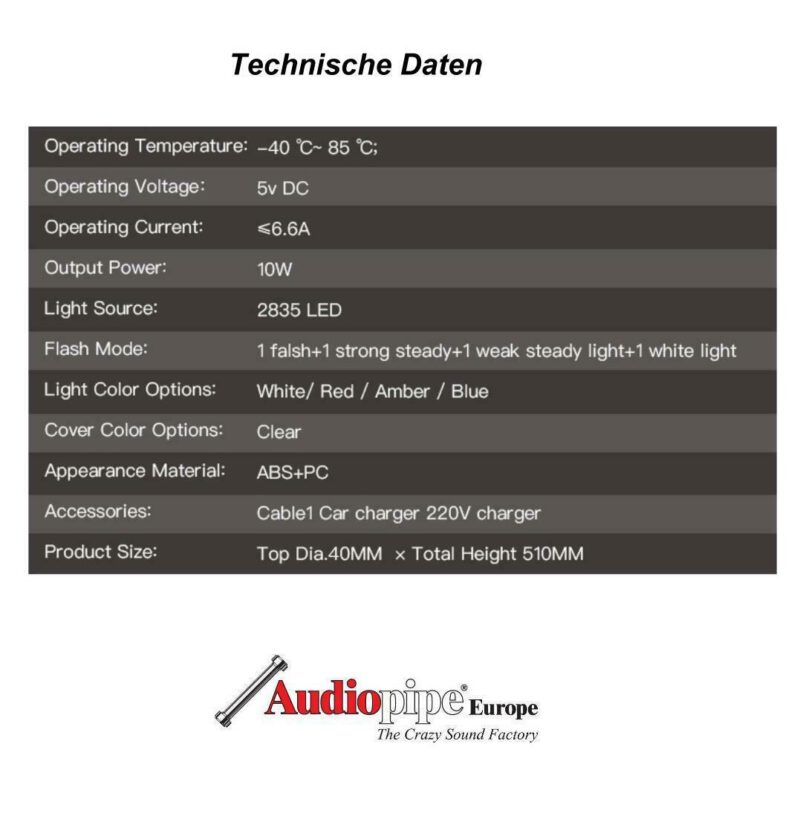 - Funktionen: Licht an (Rot), Licht blinkend (Rot), Sirene / Pfeife, Extrem helle Taschenlampe